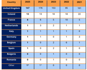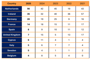 En 2025, le nombre de plaintes transfrontalières s’est élevé à 178, en baisse de 13 % sur un an, soit 26 plaintes en moins, mais parfaitement dans la moyenne (179) des plaintes annuellement traitées entre 2021 et 2025.